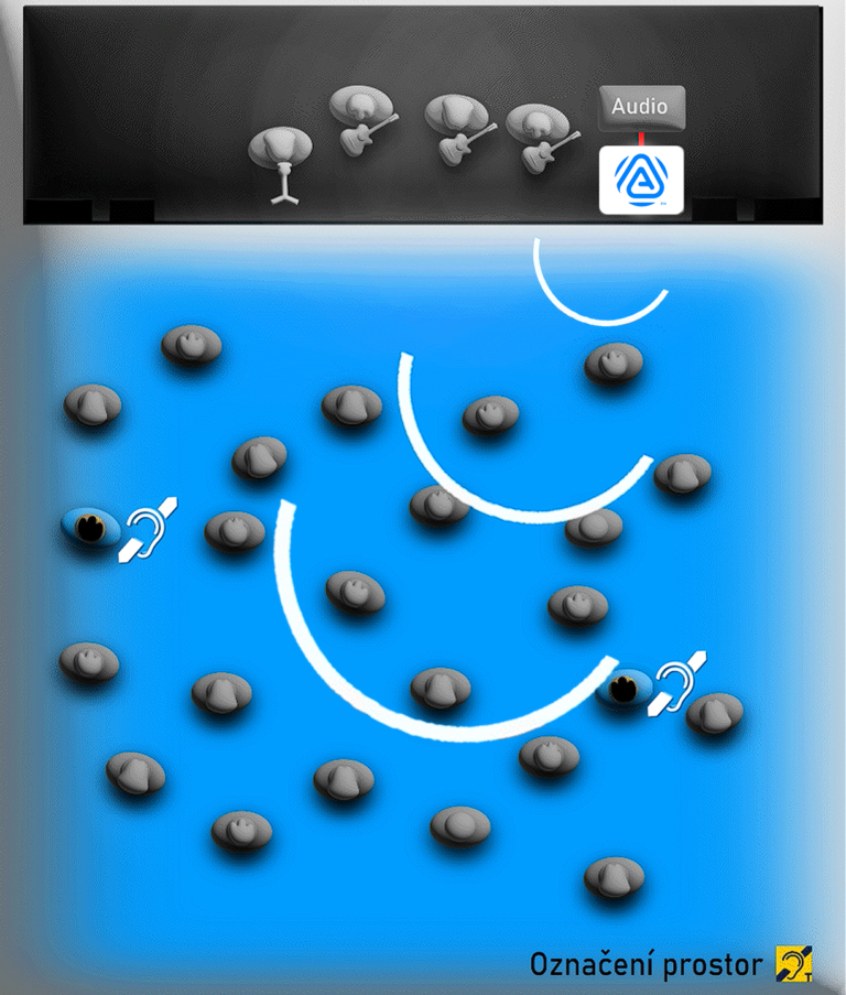 Slika 16: Vgradnja razveljavitvene zanke – enojna zanka v koncertni dvorani z odrom. Enojni kabel preprečuje, da bi signal indukcijske zanke motil signal instrumentov (npr. Električne kitare)
