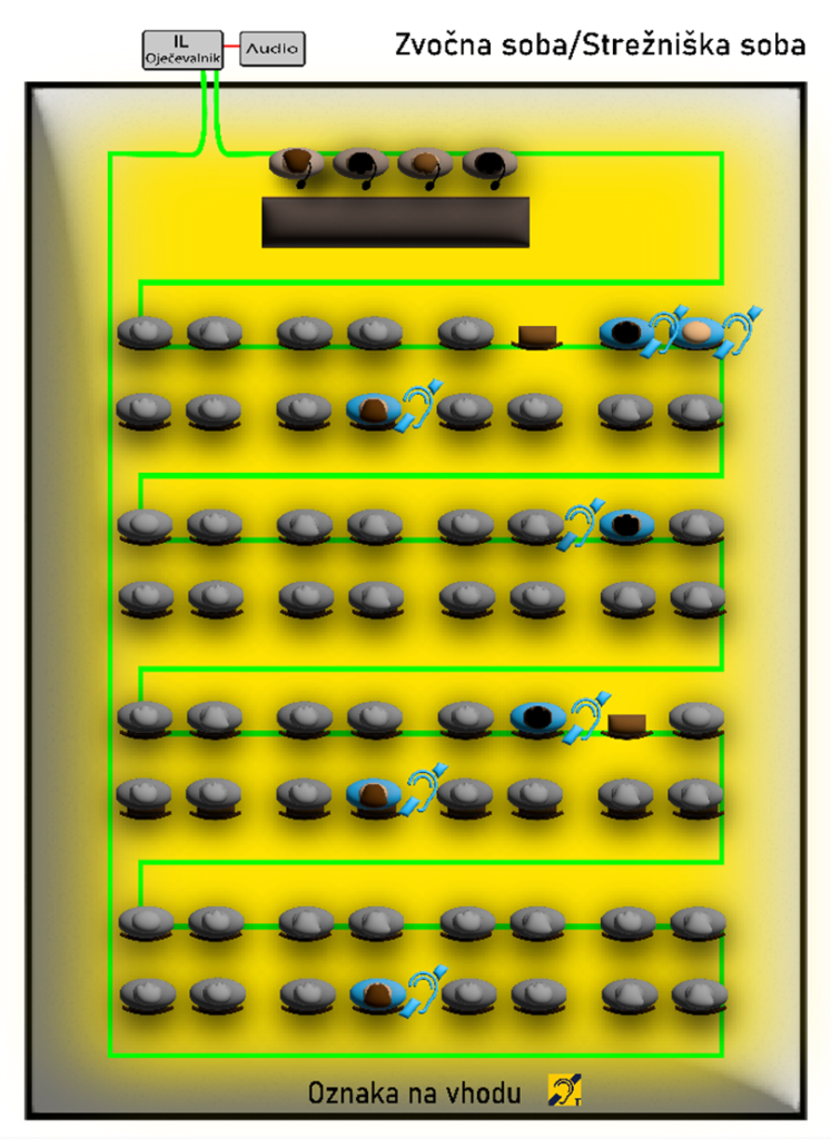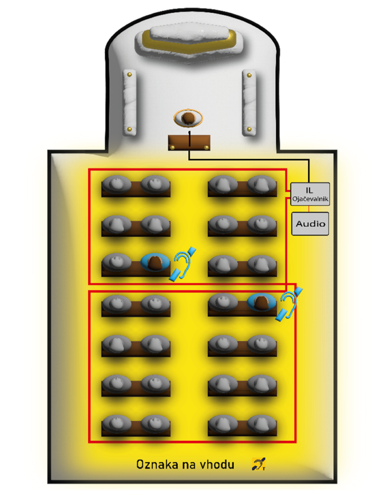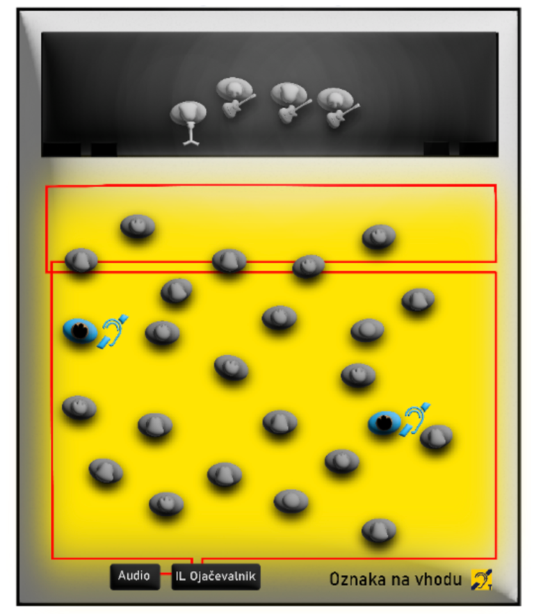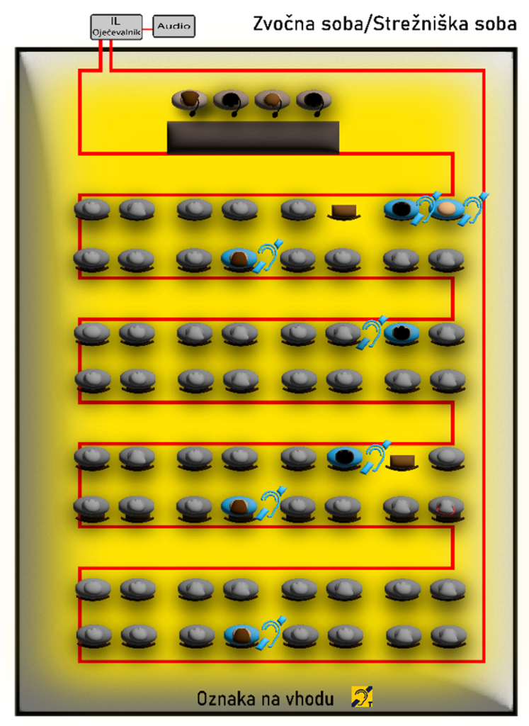• Če prostor vključuje fiksne sedeže, bo višina poslušanja približno 1,2 metra od tal. To je potrebno prilagoditi zasnovi sistemske zanke in zahtevam glede moči ojačevalnika.